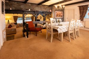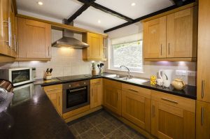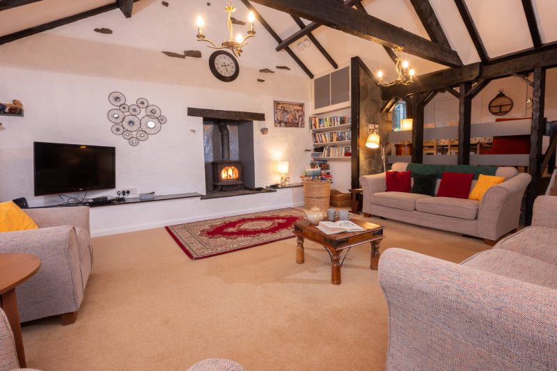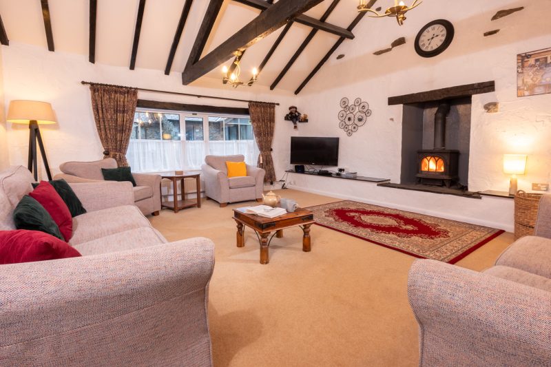 The cottage provides a surprising amount of space, revealed once you pass through the small entrance area into the main living space. What looks like a simple modern cottage from the outside, opens up to a huge vaulted living room complete with beams and ample space to relax and look out towards Lingmoor Fell; an imposing crested hill with a working quarry at its foot above Elterwater.