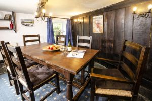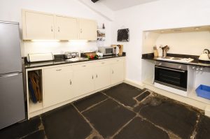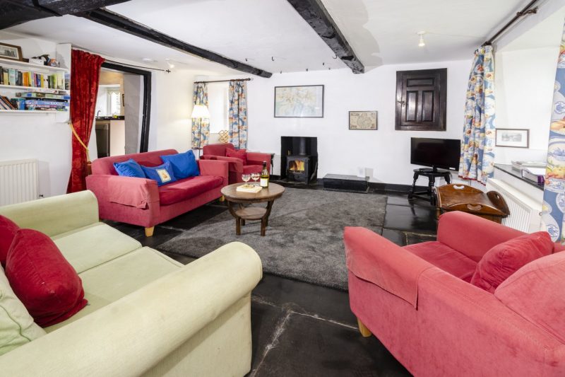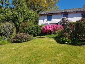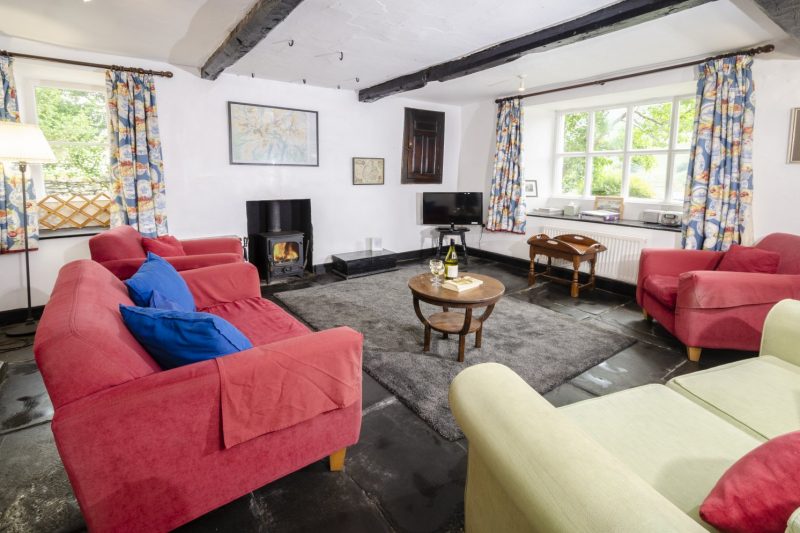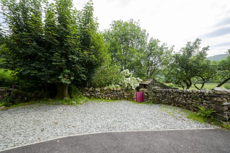 Beside this characterful cottage is a small orchard and a stone built shed suitable for storing bicycles. From the parking area, guests enter through the side door straight into a large slate floor kitchen. Beside the kitchen is the main living area with cosy log burner and views into the established and well maintained garden and across Langdale. There is a separate dining room with very old oak panelling and large dining table.