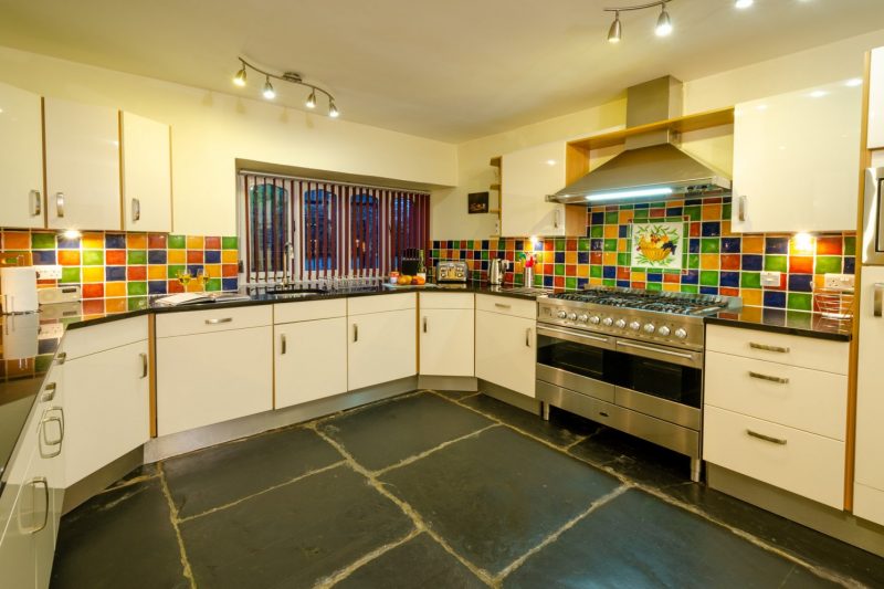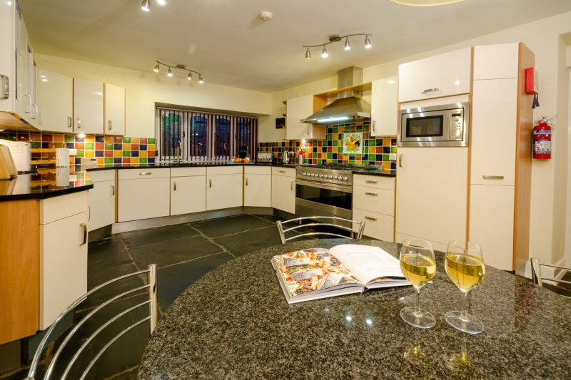 Well-equipped kitchen with range cooker, circular granite breakfast table, dishwasher, washing machine, tumble dryer, fridge, freezer and microwave