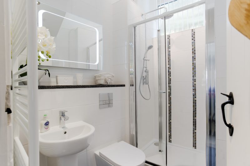 Shower room with walk-in shower, underfloor heating and heated towel rail