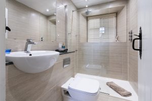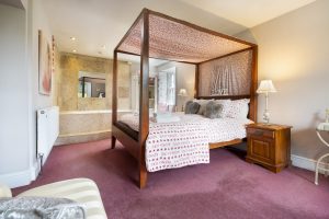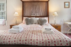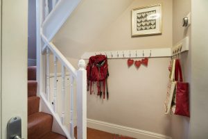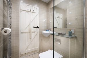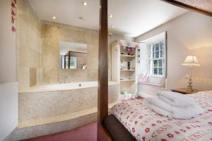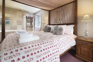 Private parking for one vehicle is located right outside Valentine Cottage. Enter through a traditional porch to the spacious open-plan living area with leather furnishings, wood-burning stove, dining and kitchen area fitted with up to date appliances for luxury holiday living along with a good Wi-Fi connection. A shower room and a neat utility area is also on the ground floor. Upstairs to the very special romantic bedroom with a modern king size four-poster bed, a ‘step-in’ couples bath and pretty wooden shutters opening up to the wonderful view. A separate dressing room is provided. Outside, an elevated sitting area with views over Ambleside to the fells provides the perfect place for sunset drinks.
