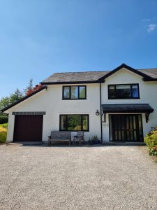The lounge is bright and airy with dual aspect patio doors to the gardens and a log burning stove. This social space is complemented with a great dining/kitchen with its bespoke dining table, access to the balcony and the modern quality, well appointed kitchen, the ideal place to prepare a hearty breakfast or family dinner looking out to the superb view of Wansfell. The bedrooms all have garden views and are bright and airy and all include Egyptian cotton linen. Three king size beds and one Superking. There are no zip and link options and the maximum occupancy is for six people. Three bedrooms are en-suite and there is also separate family bathroom and downstairs WC.